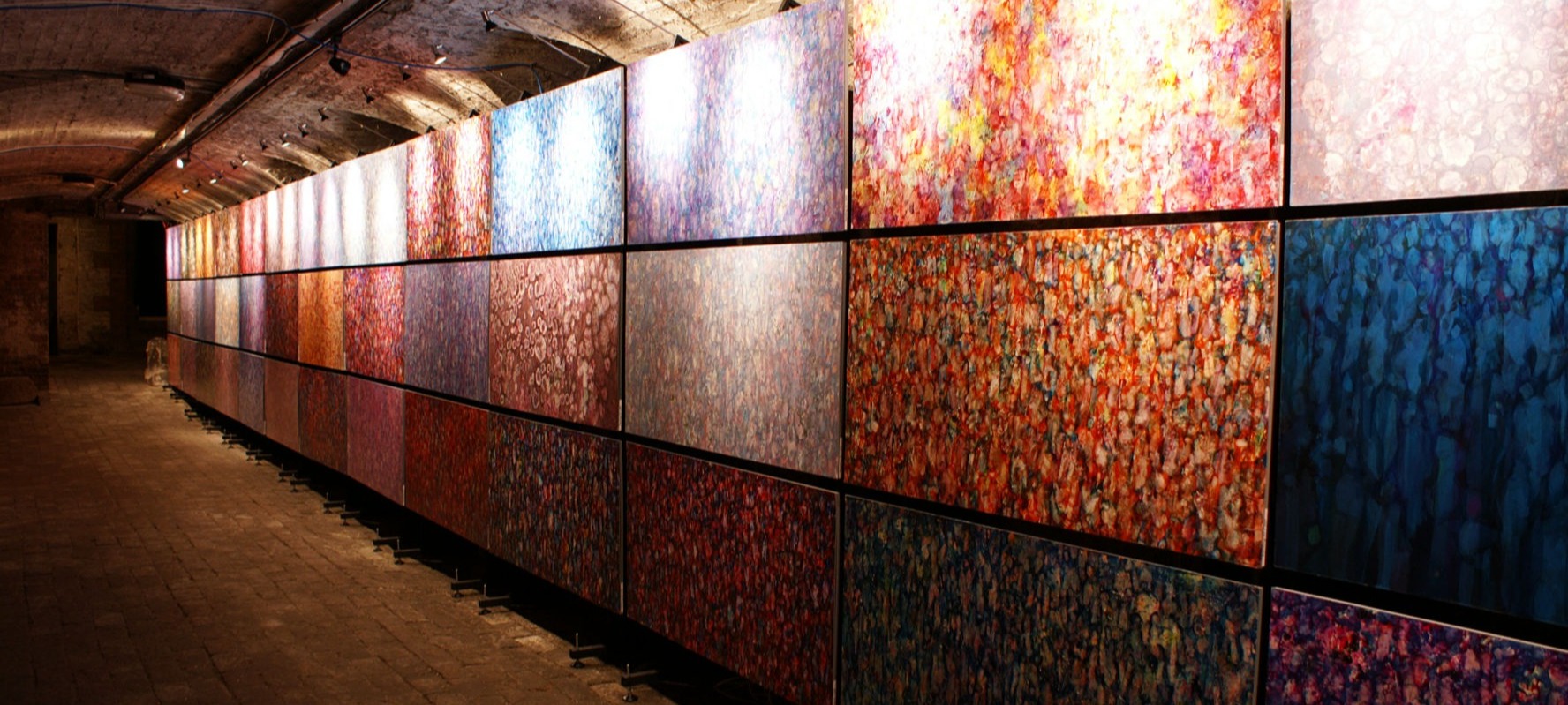 "Primeval gods haunt the painter Gregor Harvie, Khaos, and Eros (love, the life-bringer). Spread across the fifty intense paintings of his new show, Eros has triumphed – life has proliferated so fast that Gaia is exhausted. Logic predicts that, full circle, Khaos will prevail in the future, but all we can see in The Crypt Gallery (the underworld!), where the fifty paintings are densely hung, is exponential cellular division evolving through to teeming crowds... That's the point – in a word, over-population – but if you didn't know it the pictures would stand alone, each representative of the whole. I like the cellular division ones best; by dropping turps onto a wet paint surface, Harvie has created really very beautiful filigree patterns. According to his innate sense of colour and tone, the accidental marks are harmoniously arranged, and beautifully delicate – individual qualities that counterpoint the apocalyptic message of the show."